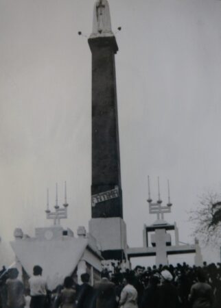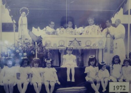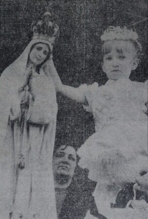 Rainha de Fátima rodeada das princesas - Imagem de Fátima e o Clero ao fundo