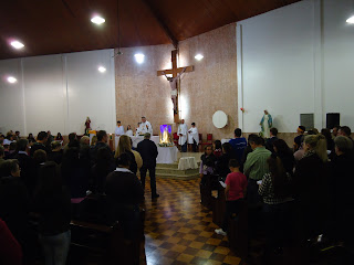 Nesta noite a imagem de Nossa Senhora de Fátima foi colocada junto ao palco onde se apresentava a banda (Eterna Aliança da cidade de Pelotas), grupo carismático com seus instrumentos, coreografias e cantores.